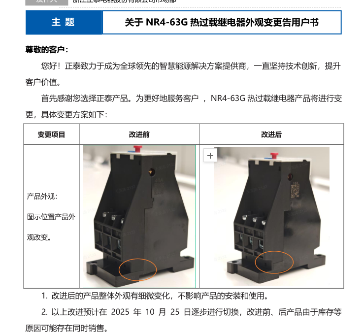 關(guān)于 NR4-63G 熱過(guò)載繼電器外觀變更告用戶書(shū)