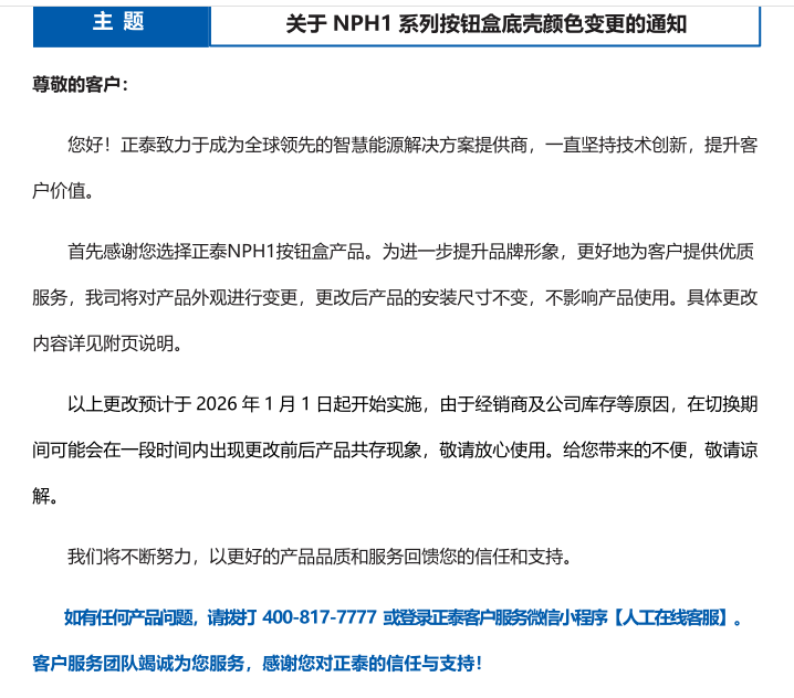 關于 NPH1 系列按鈕盒底殼顏色變更的通知