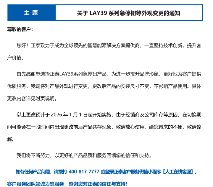 關于 LAY39 系列急停鈕等外觀變更的通知