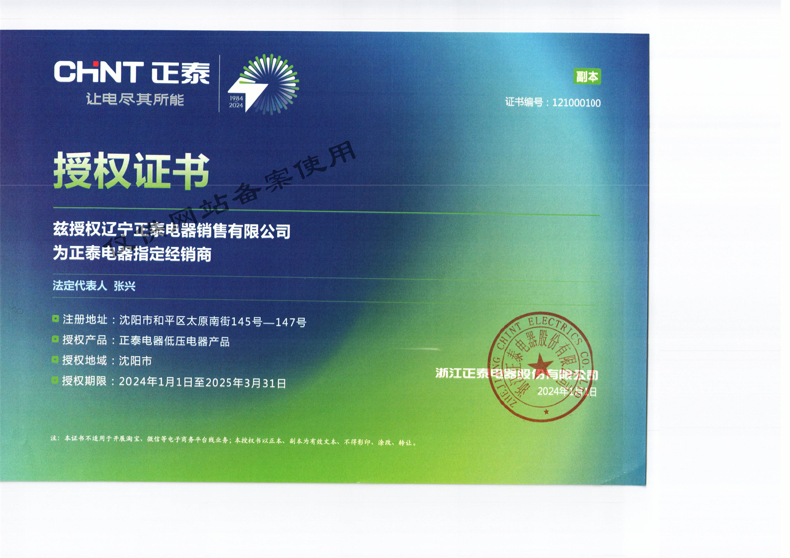 浙江正泰電器股份有限公司授權證書