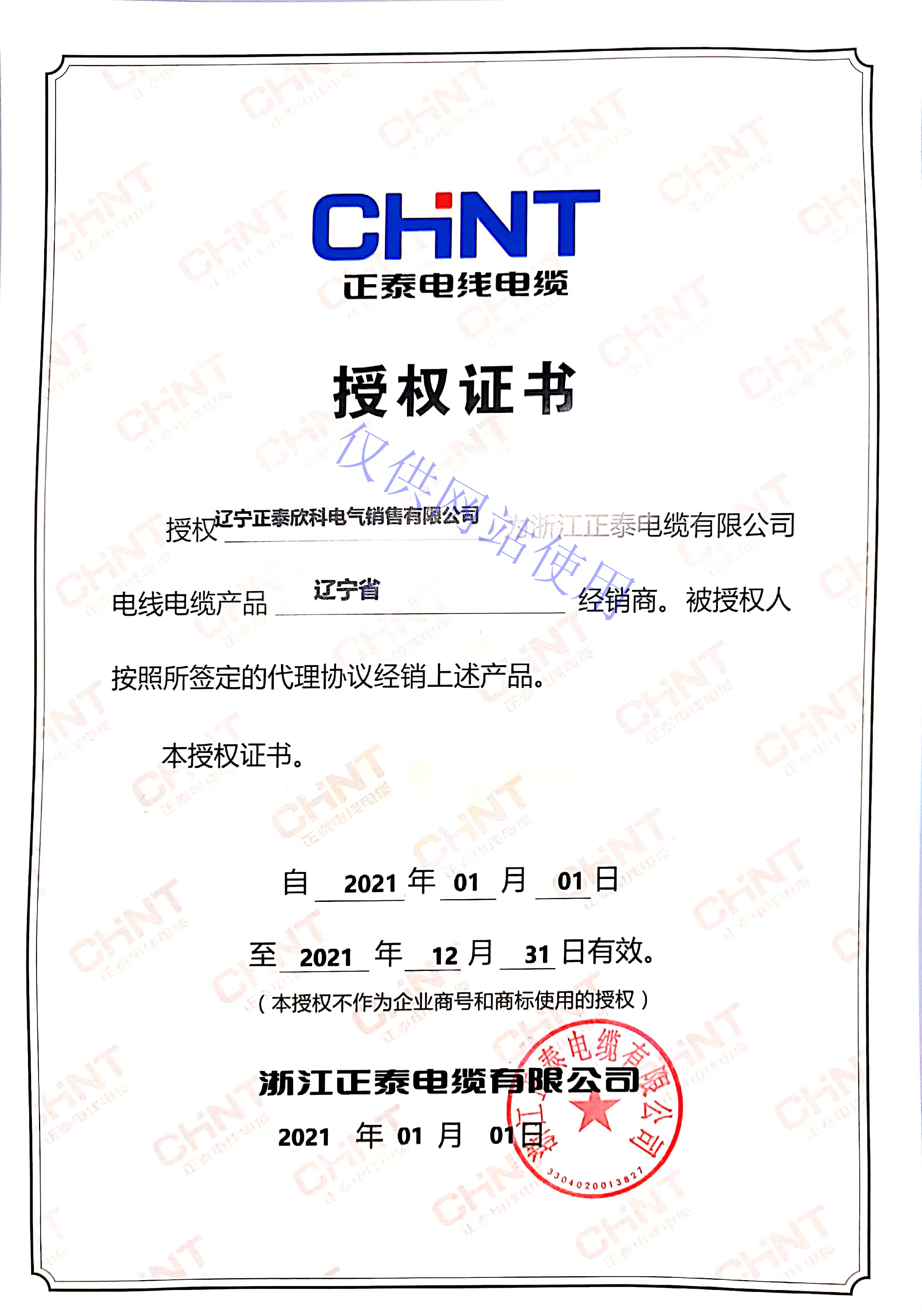 浙江正泰電器股份有限公司授權(quán)證書